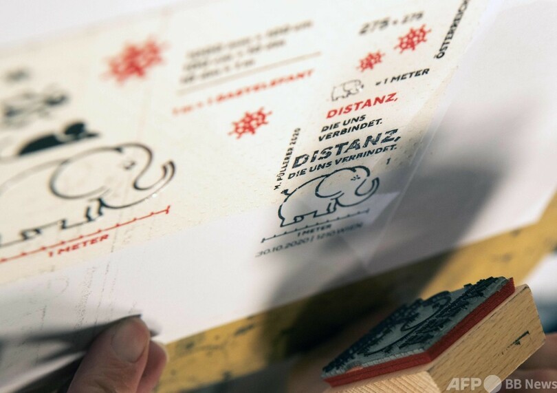 切手に描かれた赤ちゃんゾウは流行初期にオーストリア政府が導入したキャラクターで、感染防止のために必要とされる対人距離1メートルを象徴している。