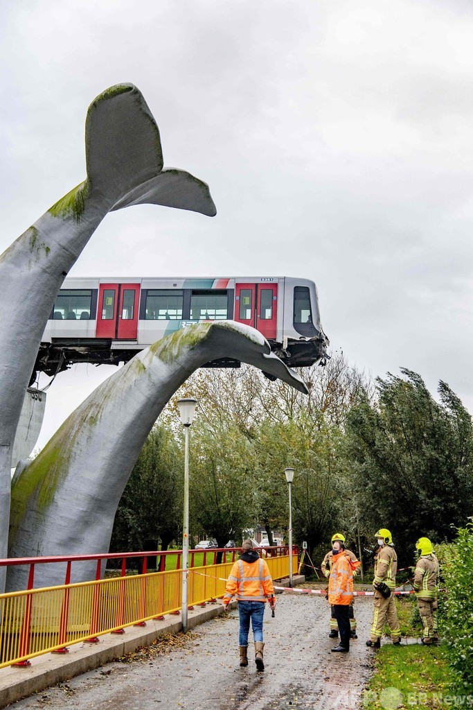 【11月3日 AFP】オランダ・ロッテルダム(Rotterdam)近郊で2日、地下鉄の電車が車止めを突き破って脱線したものの、クジラの尾の彫刻の上に乗り上げ、下の水面に落ちずに惨事を逃れる出来事があった。