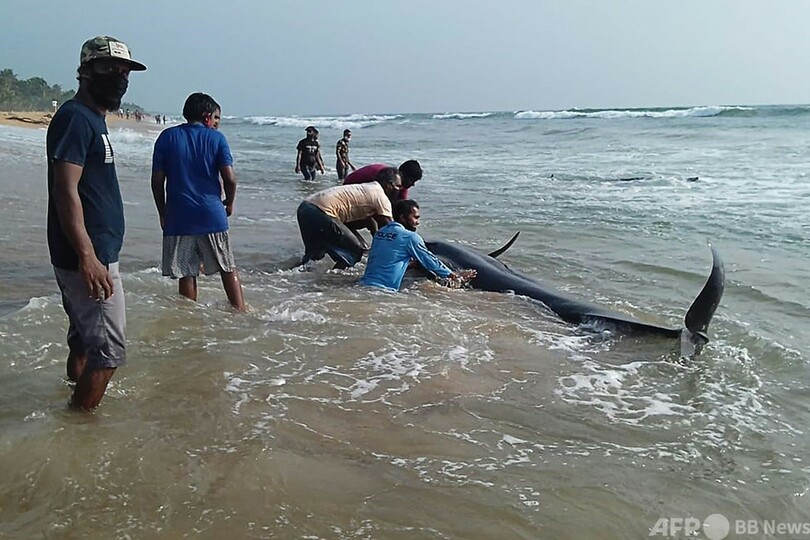 浜辺にクジラ100頭漂着 スリランカで過去最多、救出活動続く
