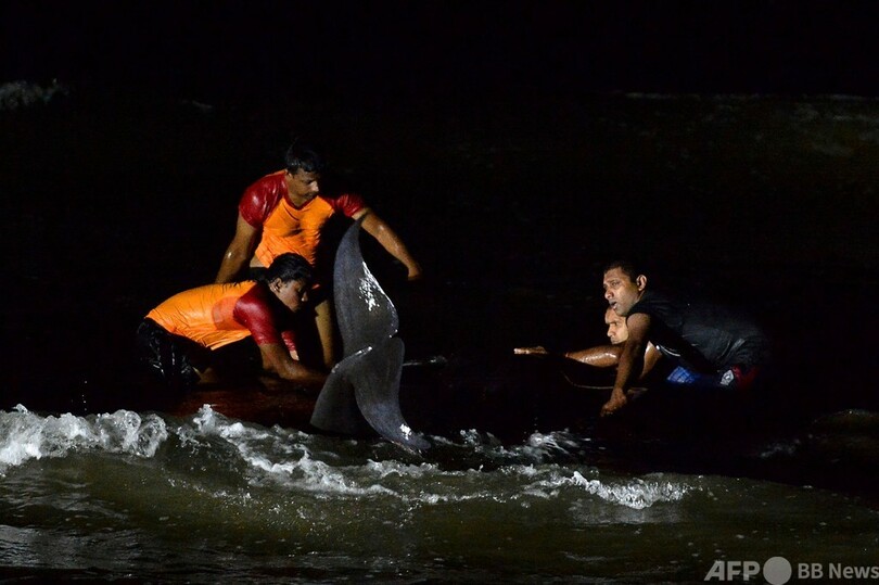 浜辺にクジラ100頭漂着 スリランカで過去最多、救出活動続く
