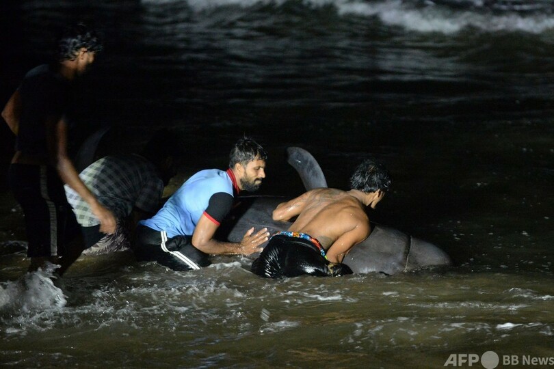 浜辺にクジラ100頭漂着 スリランカで過去最多、救出活動続く