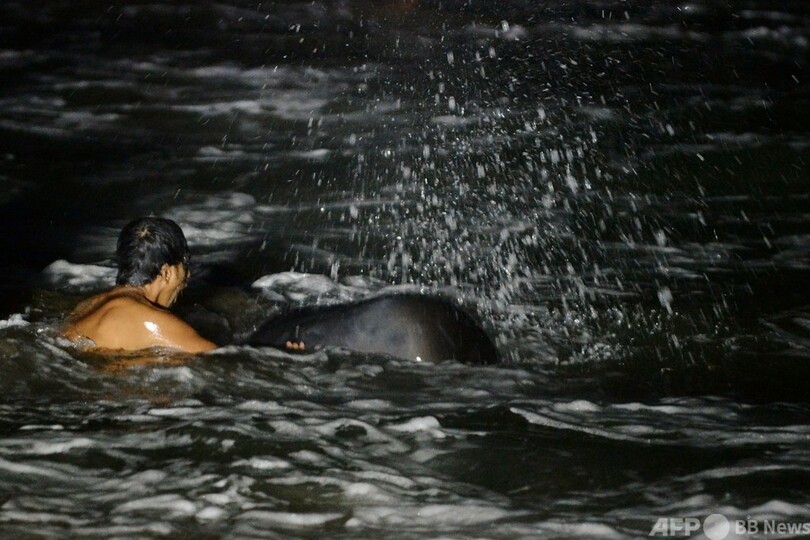 浜辺にクジラ100頭漂着 スリランカで過去最多、救出活動続く