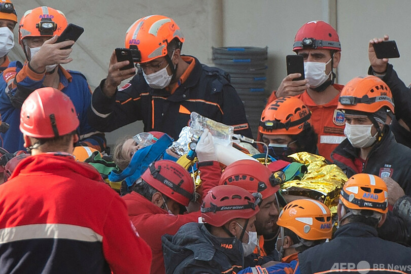 【11月3日 AFP】(写真追加)10月30日に発生したトルコ・ギリシャ沖のエーゲ海(Aegean Sea)地震の被災地トルコ西部バイラクル(Bayrakli)で3日、がれきの中から3歳の女児が91時間ぶりに救出された。地元市長と現地入りしているAFP特派員が伝えた。