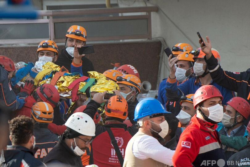 【11月3日 AFP】(写真追加)10月30日に発生したトルコ・ギリシャ沖のエーゲ海(Aegean Sea)地震の被災地トルコ西部バイラクル(Bayrakli)で3日、がれきの中から3歳の女児が91時間ぶりに救出された。地元市長と現地入りしているAFP特派員が伝えた。