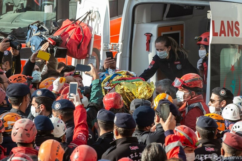 【11月3日 AFP】(写真追加)10月30日に発生したトルコ・ギリシャ沖のエーゲ海(Aegean Sea)地震の被災地トルコ西部バイラクル(Bayrakli)で3日、がれきの中から3歳の女児が91時間ぶりに救出された。地元市長と現地入りしているAFP特派員が伝えた。