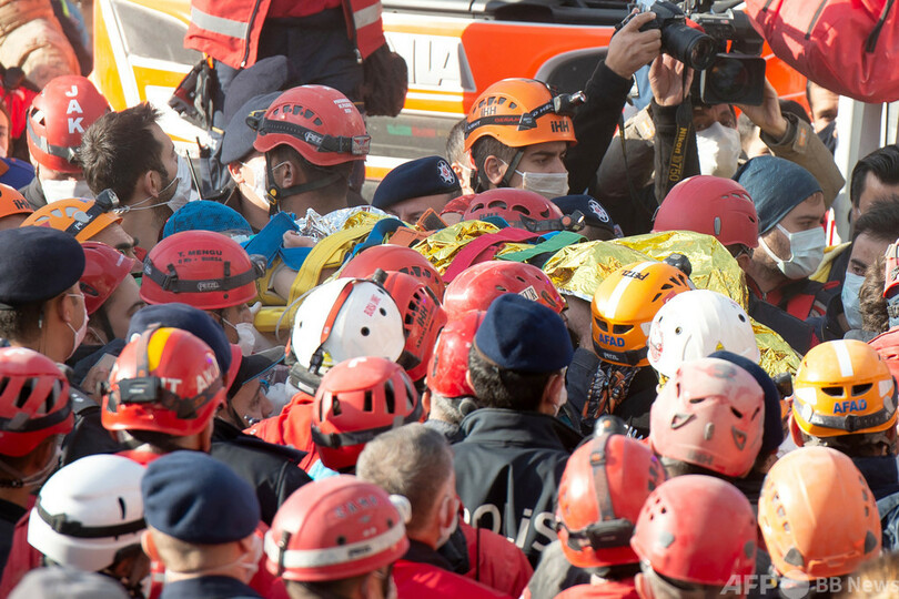 【11月3日 AFP】(写真追加)10月30日に発生したトルコ・ギリシャ沖のエーゲ海(Aegean Sea)地震の被災地トルコ西部バイラクル(Bayrakli)で3日、がれきの中から3歳の女児が91時間ぶりに救出された。地元市長と現地入りしているAFP特派員が伝えた。