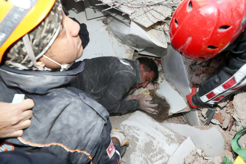 【11月3日 AFP】(写真追加)10月30日に発生したトルコ・ギリシャ沖のエーゲ海(Aegean Sea)地震の被災地トルコ西部バイラクル(Bayrakli)で3日、がれきの中から3歳の女児が91時間ぶりに救出された。地元市長と現地入りしているAFP特派員が伝えた。