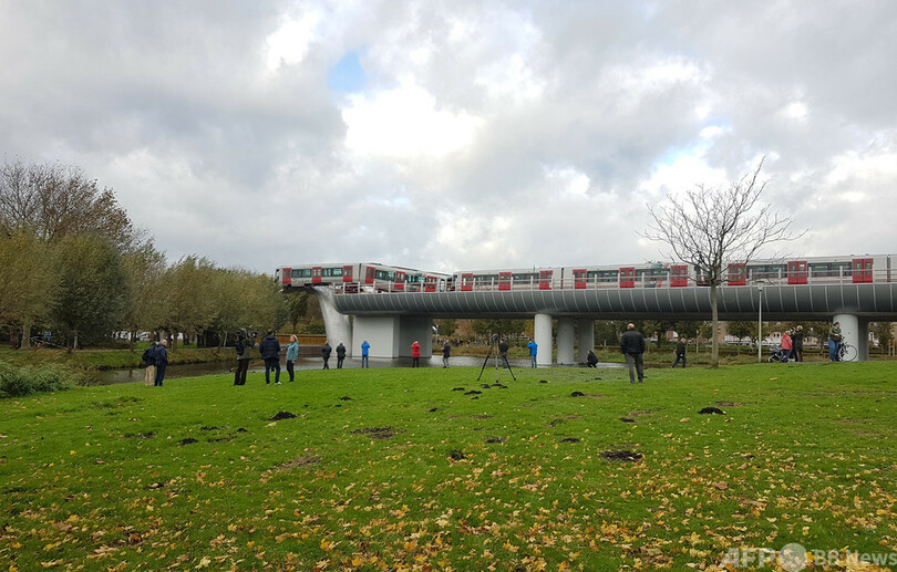 電車は前日2日スパイケニッセ(Spijkenisse)で、車止めを突き破って脱線。しかしこの巨大彫刻に支えられ、10メートル下の水面に落下せずに済んだ。(c)AFP