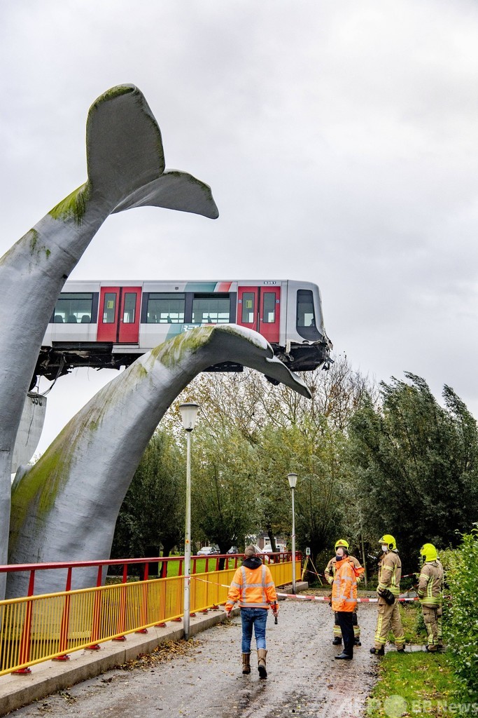 【11月3日 AFP】オランダ・ロッテルダム(Rotterdam)近郊で3日、脱線したもののクジラの尾の彫刻の上に乗り上げて惨事を免れた地下鉄の車両を、クレーンを使って撤去する作業が行われた。