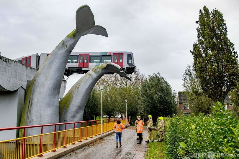 【11月3日 AFP】オランダ・ロッテルダム(Rotterdam)近郊で3日、脱線したもののクジラの尾の彫刻の上に乗り上げて惨事を免れた地下鉄の車両を、クレーンを使って撤去する作業が行われた。