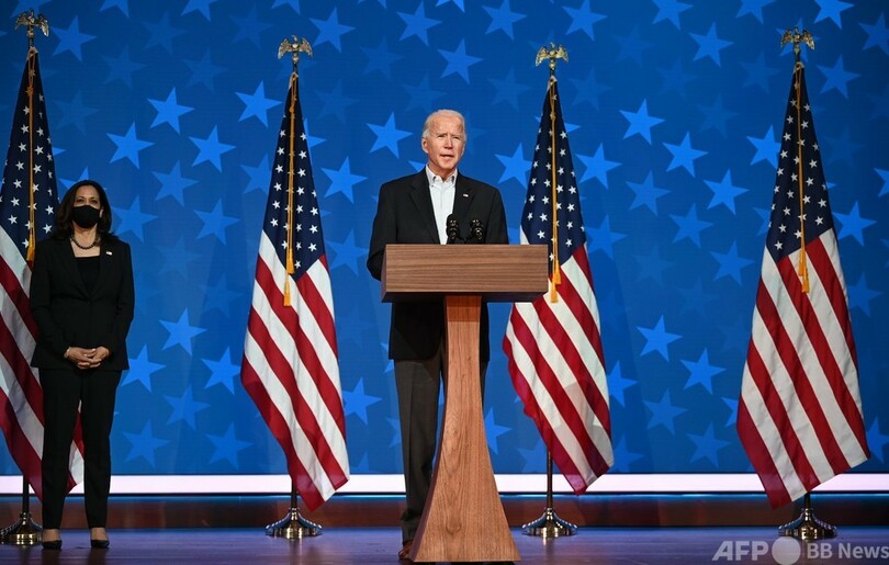 地元デラウェア州ウィルミントン(Wilmington)で記者会見したバイデン氏は「今の状況には非常に満足している。集計が終わった時に、(カマラ・)ハリス(Kamala Harris)上院議員と私が勝者と宣言されることを、われわれは確信している」と述べた。(c)AFP