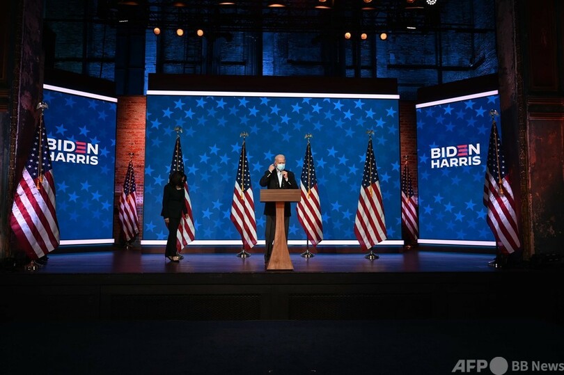 地元デラウェア州ウィルミントン(Wilmington)で記者会見したバイデン氏は「今の状況には非常に満足している。集計が終わった時に、(カマラ・)ハリス(Kamala Harris)上院議員と私が勝者と宣言されることを、われわれは確信している」と述べた。(c)AFP