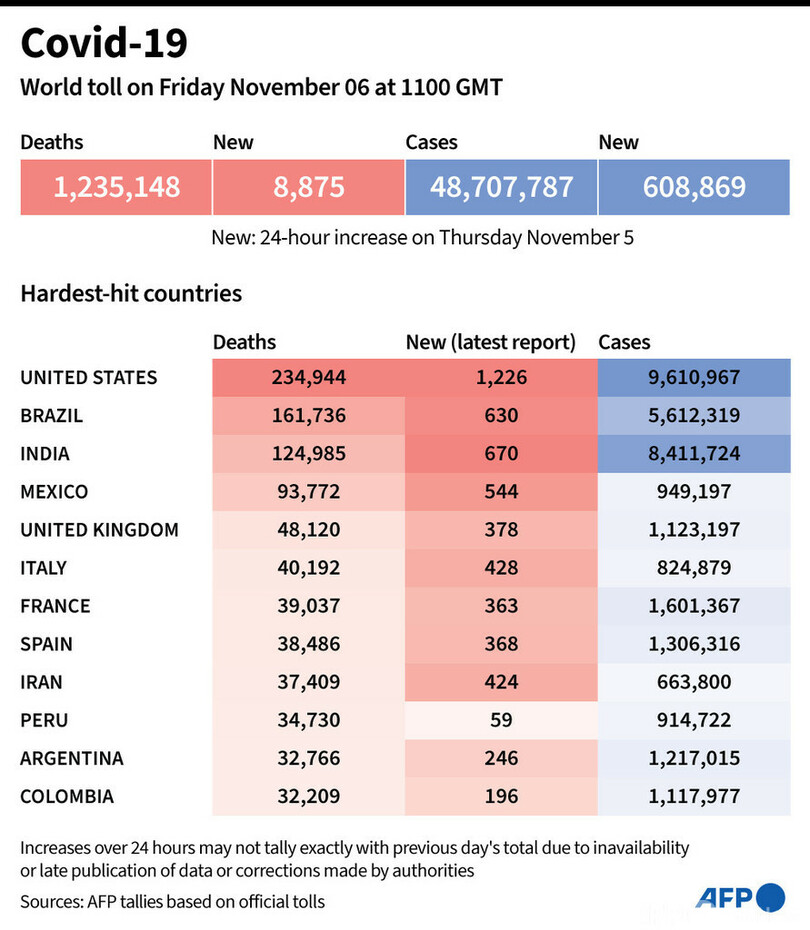 【11月7日 AFP】AFPが各国当局の発表に基づき日本時間6日午後8時にまとめた統計によると、世界の新型コロナウイルスによる死者数は123万5148人に増加した。