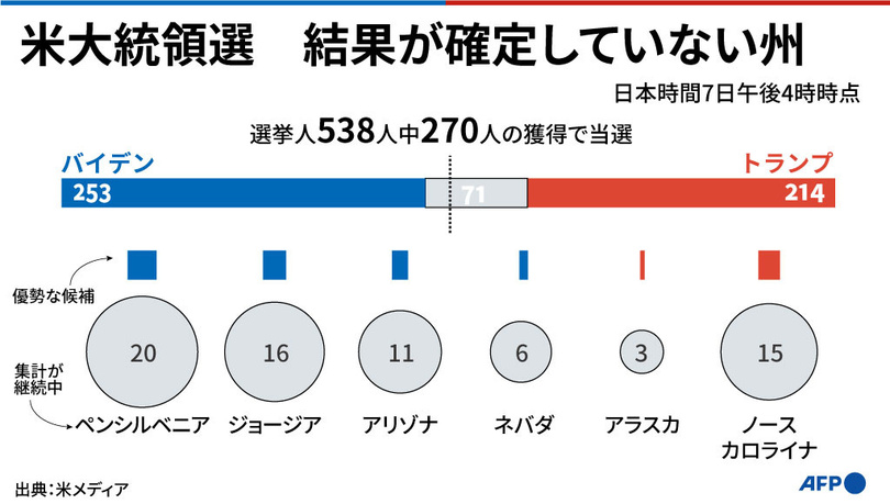 ニュース 政治・経済 米大統領選2020 図解 【図解】米大統領選、結果が確定していない州 2020年11月7日 23:24 発信地:米国 [ 米国 北米 ] このニュースをシェア 米大統領選で、開票結果がまだ確定していない6州を示した図。(c)GAL ROMA / AFP 【11月7日 AFP】(更新)大接戦となっている米大統領選で、開票結果がまだ確定していない6州を示した図。(c)AFP 特集:米大統領選2020 2020年11月3日、米大統領選挙の投開票が行われ、民主党のジョー・バイデン前副大統領が勝利を確実にした。 政治・経済 一覧へ> メディア・報道関係・法人の方向け 写真・動画 購入のお問合せ>