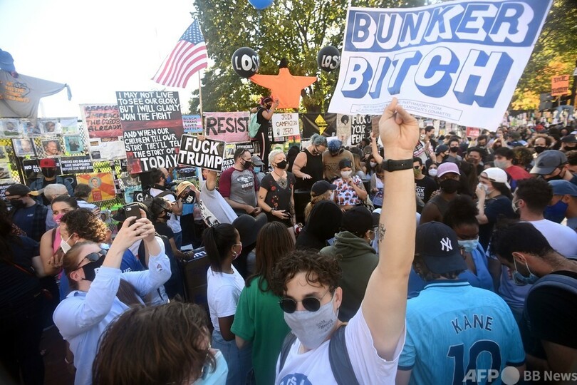 トランプ氏は7日午前、バージニア州に自身が所有するゴルフクラブでゴルフのプレー中にバイデン氏当確のニュースに接し、ホワイトハウス(White House)に戻った。大統領の車列は、ホワイトハウスの向かいにありトランプ氏敗北を喜ぶ大勢の人たちが集まったブラック・ライブズ・マター広場(Black Lives Matter Plaza)のそばを通った。(c)AFP