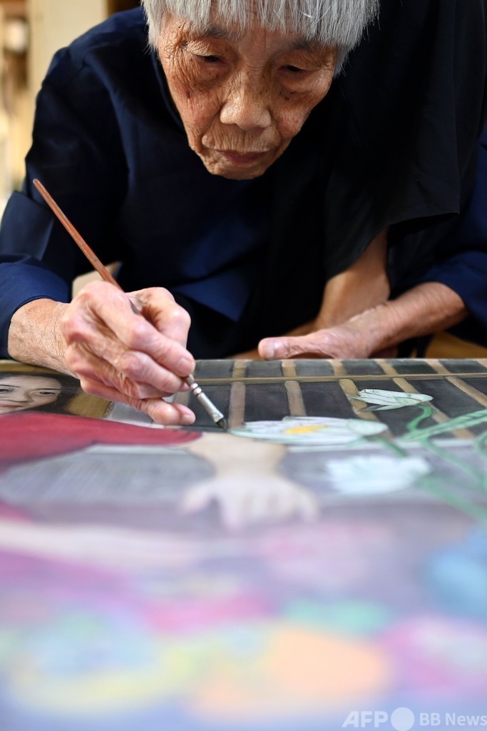 【11月15日 AFP】もうすぐ90歳になるベトナム人画家、モン・ビック(Mong Bich)さんは、お気に入りのタイル張りの部屋で作業する場所を決めて座り、光の加減を確認して描き始めた。