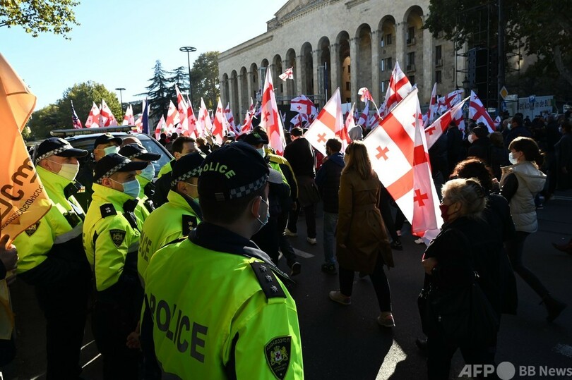 8日午後、首都トビリシの目抜き通りには5つの十字架が描かれた赤と白のジョージア国旗が幾つもはためき、議会前にはマスクをした人ら約4万5000人が集結した。デモ参加者らは、夕方から市内を行進し、数キロ離れた中央選管の建物に向かった。