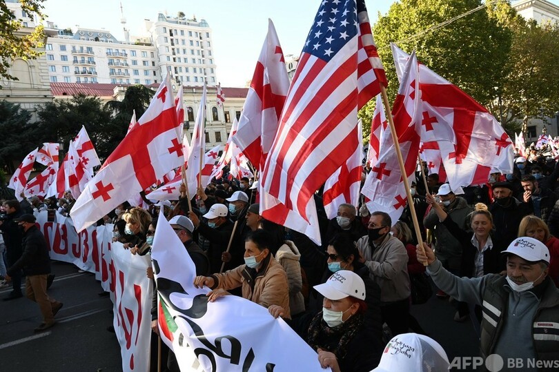 8日午後、首都トビリシの目抜き通りには5つの十字架が描かれた赤と白のジョージア国旗が幾つもはためき、議会前にはマスクをした人ら約4万5000人が集結した。デモ参加者らは、夕方から市内を行進し、数キロ離れた中央選管の建物に向かった。