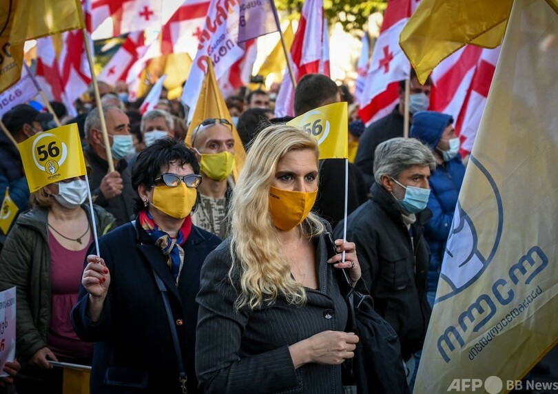 8日午後、首都トビリシの目抜き通りには5つの十字架が描かれた赤と白のジョージア国旗が幾つもはためき、議会前にはマスクをした人ら約4万5000人が集結した。デモ参加者らは、夕方から市内を行進し、数キロ離れた中央選管の建物に向かった。