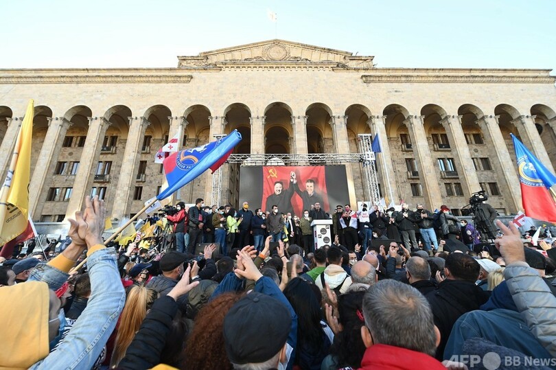 8日午後、首都トビリシの目抜き通りには5つの十字架が描かれた赤と白のジョージア国旗が幾つもはためき、議会前にはマスクをした人ら約4万5000人が集結した。デモ参加者らは、夕方から市内を行進し、数キロ離れた中央選管の建物に向かった。