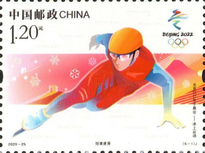 切手は1セット5枚で、それぞれ、種目であるショートトラック、フィギュアスケート、スピードスケート、カーリング、アイスホッケーをデザインに使ったものです。(c)CGTN Japanese/AFPBB News
