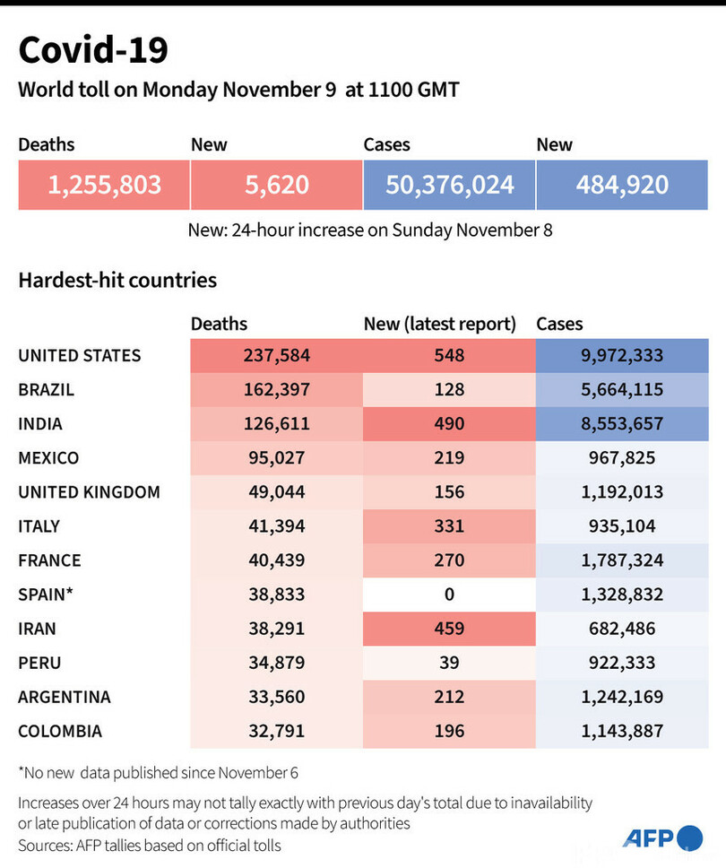 【11月9日 AFP】AFPが各国当局の発表に基づき日本時間9日午後8時にまとめた統計によると、世界の新型コロナウイルスによる死者数は125万5803人に増加した。