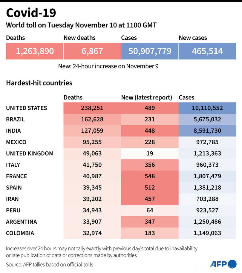 【11月10日 AFP】AFPが各国当局の発表に基づき日本時間10日午後8時にまとめた統計によると、世界の新型コロナウイルスによる死者数は126万3890人に増加した。