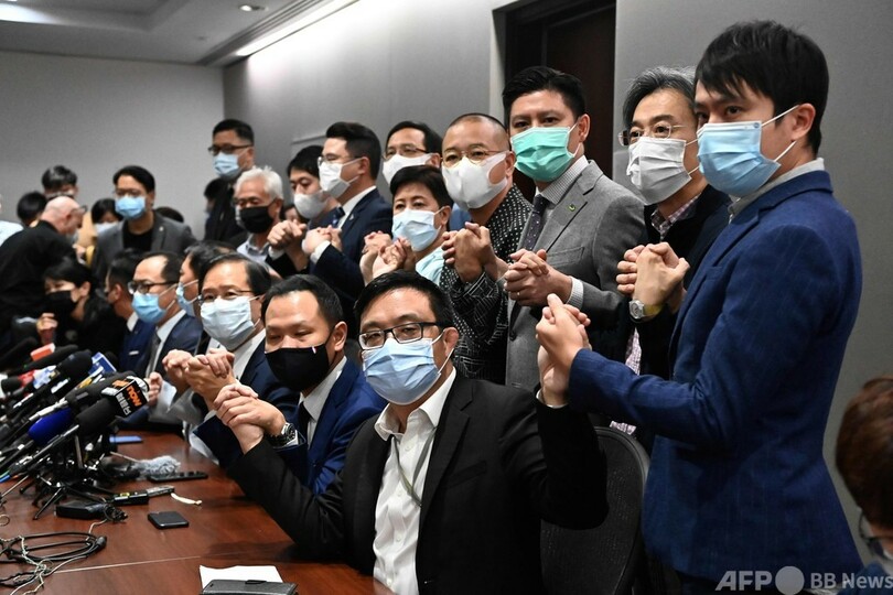 【11月11日 AFP】(更新)香港・立法会(議会)の民主派議員らは11日、集団辞職を表明した。これに先立ち、中国の全国人民代表大会(全人代、National People's Congress、国会に相当)の常務委員会が香港政府に対し、国家安全保障上の脅威とみなす議員の資格剥奪を認め、議員4人が資格を剥奪されていた。