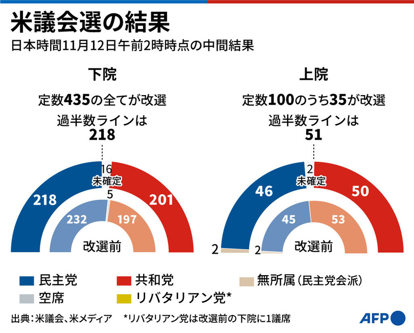 上院ではこれまでに、定数100議席のうち共和党が50議席、民主党が48議席を確保。残る2議席は、来年1月5日に行われる南部ジョージア州の決選投票で決まる。
