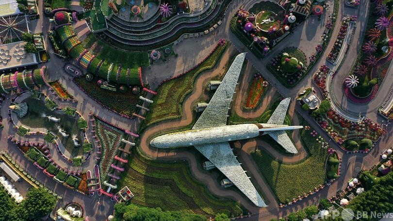 同園に展示されている花でできたエミレーツ航空(Emirates)エアバス(Airbus)A380型機の模型は、ギネス世界記録(Guinness World Records)に認定されている。(c)AFP