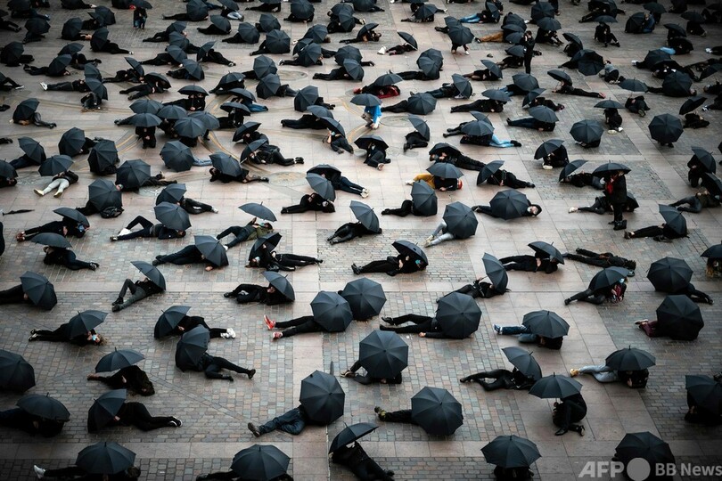 【11月16日 AFP】フランス南部トゥールーズ(Toulouse)で、新型コロナウイルスの感染防止のために再導入されたロックダウン(都市封鎖)措置の一つの「必須ではない」業務の閉鎖に対し、抗議するさまざまな職業の人々。(c)AFP