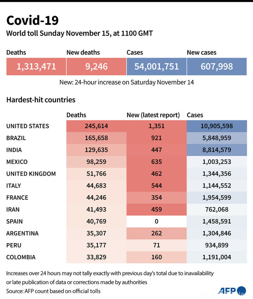 【11月16日 AFP】AFPが各国当局の発表に基づき日本時間15日午後8時にまとめた統計によると、世界の新型コロナウイルスによる死者数は131万3471人に増加した。
