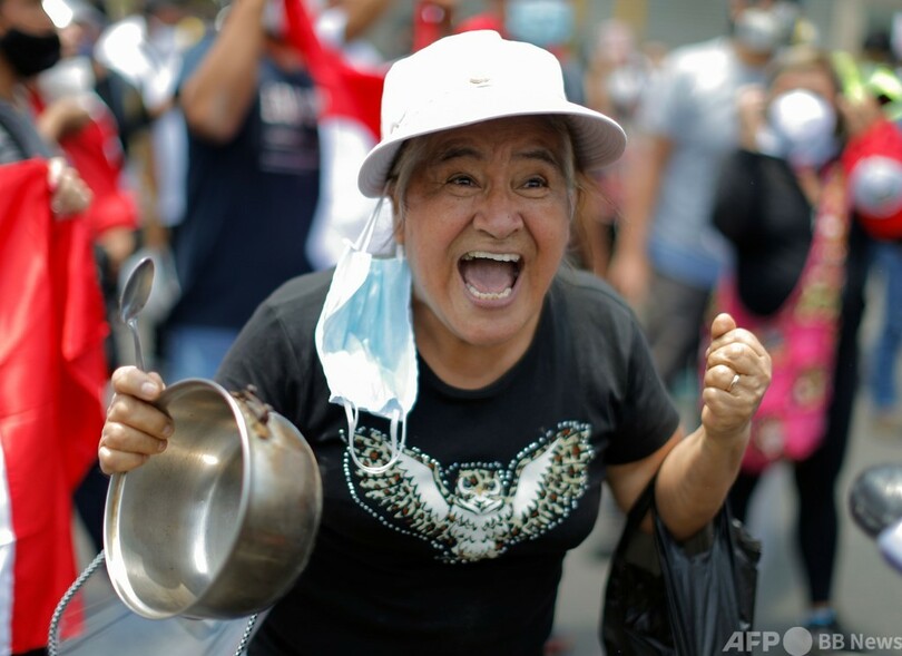 フランシスコ・サガスティ氏は中道・野党「紫の党(Morado)」所属。同国では、人気の高かったマルティン・ビスカラ(Martin Vizcarra)前大統領が罷免され、マヌエル・メリノ(Manuel Merino)氏が9日に大統領に就任した。しかしこれに抗議するデモが続き、メリノ氏も15日に辞任を表明した。この抗議デモで2人が死亡している。(c)AFP