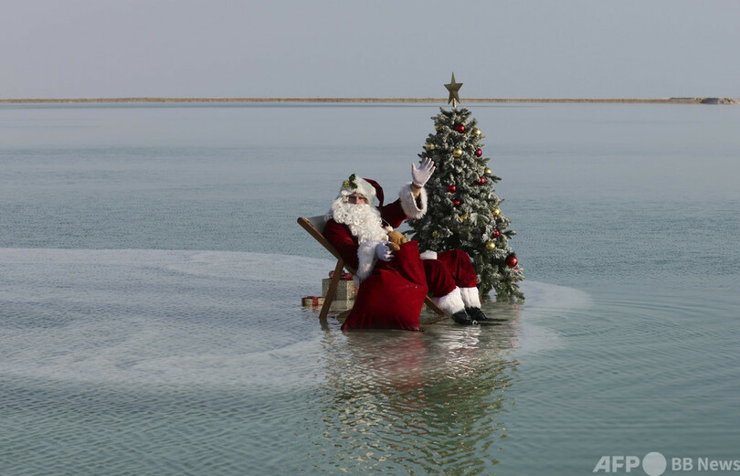 【11月18日 AFP】イスラエルのリゾート、エンボケック(Ein Boqeq)の死海(Dead Sea)で15日、塩でできた「砂浜」でくつろぐサンタクロースの姿がみられた。