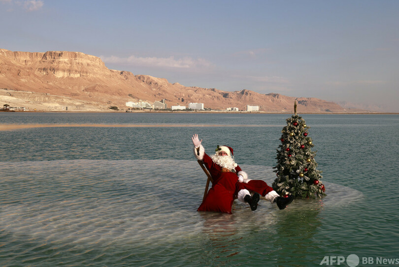 【11月18日 AFP】イスラエルのリゾート、エンボケック(Ein Boqeq)の死海(Dead Sea)で15日、塩でできた「砂浜」でくつろぐサンタクロースの姿がみられた。