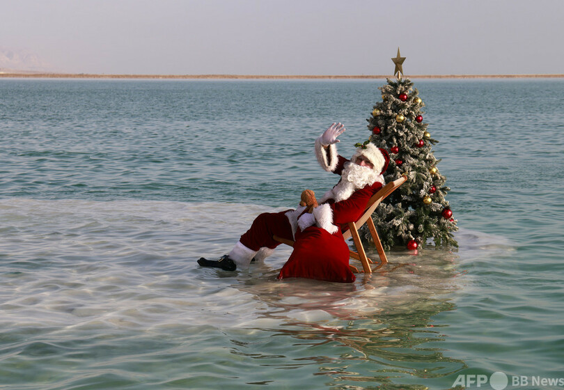 【11月18日 AFP】イスラエルのリゾート、エンボケック(Ein Boqeq)の死海(Dead Sea)で15日、塩でできた「砂浜」でくつろぐサンタクロースの姿がみられた。