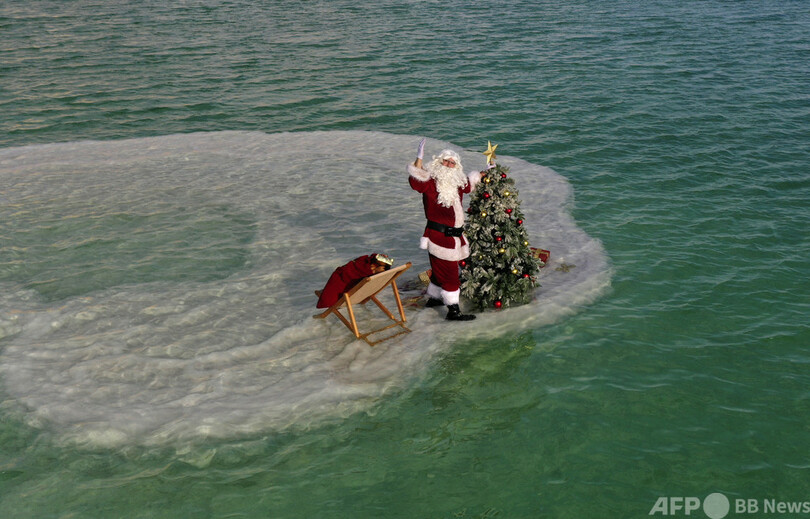 【11月18日 AFP】イスラエルのリゾート、エンボケック(Ein Boqeq)の死海(Dead Sea)で15日、塩でできた「砂浜」でくつろぐサンタクロースの姿がみられた。