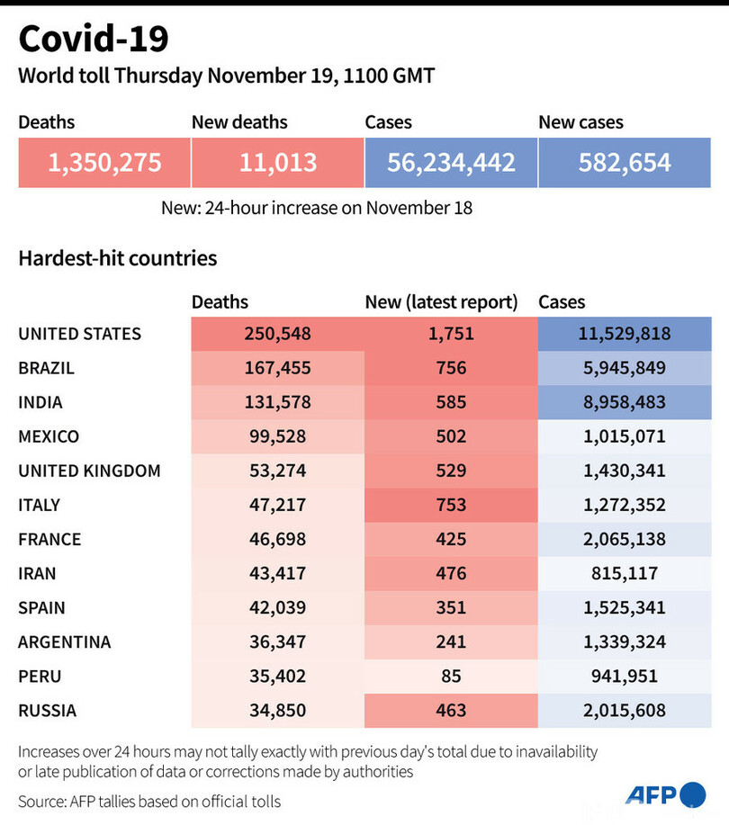 【11月19日 AFP】AFPが各国当局の発表に基づき日本時間19日午後8時にまとめた統計によると、世界の新型コロナウイルスによる死者数は135万275人に増加した。