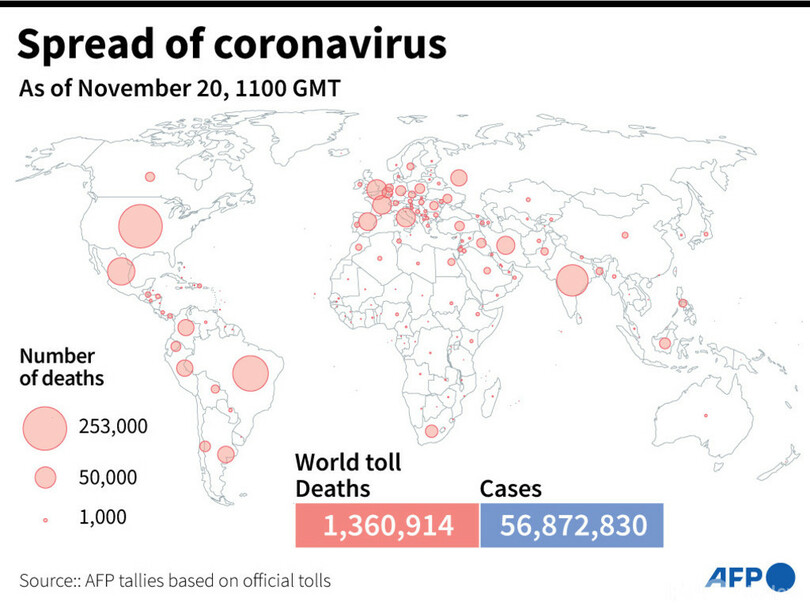 【11月20日 AFP】AFPが各国当局の発表に基づき日本時間20日午後8時にまとめた統計によると、世界の新型コロナウイルスによる死者数は136万914人に増加した。