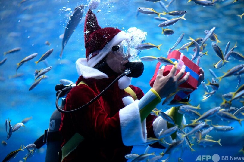 【11月22日 AFP】神奈川県の横浜・八景島シーパラダイス(Yokohama Hakkeijima Sea Paradise)では、サンタクロースに扮(ふん)したダイバーがマンボウに餌を与えるイベントが行われている。(c)AFP
