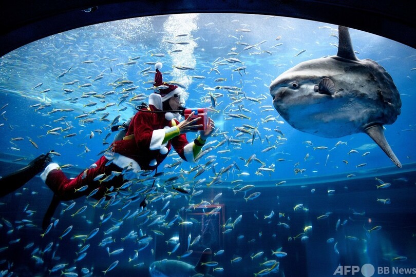 【11月22日 AFP】神奈川県の横浜・八景島シーパラダイス(Yokohama Hakkeijima Sea Paradise)では、サンタクロースに扮(ふん)したダイバーがマンボウに餌を与えるイベントが行われている。(c)AFP