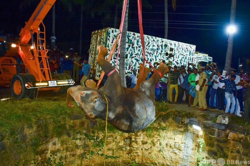 【11月23日 AFP】インド南部タミルナド(Tamil Nadu)州ダルマプリ(Dharmapuri)で19日、井戸に落ちた野生のゾウが16時間に及ぶ救出活動の末、クレーンで引き上げられた。