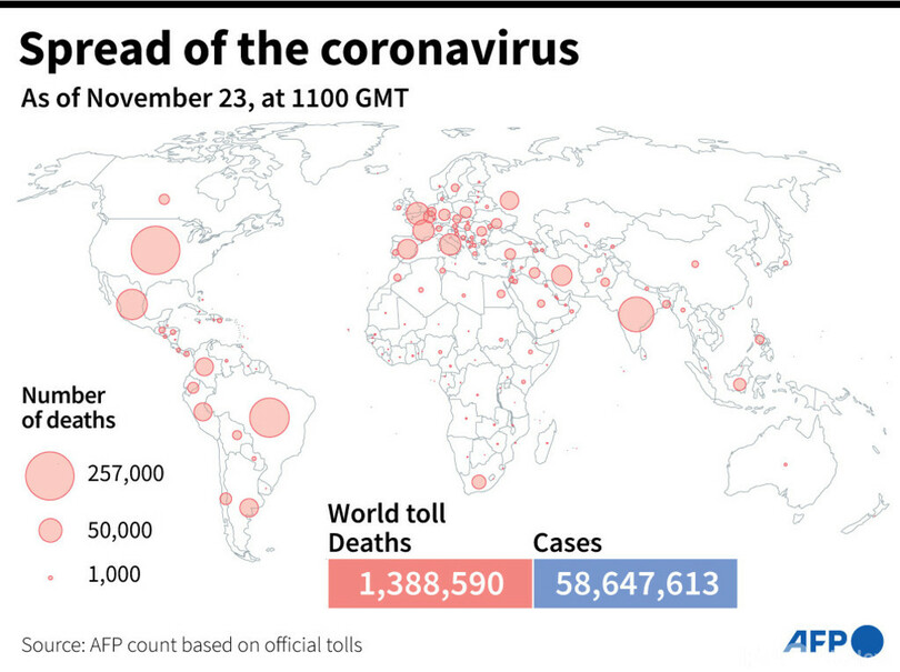 【11月23日 AFP】AFPが各国当局の発表に基づき日本時間23日午後8時にまとめた統計によると、世界の新型コロナウイルスによる死者数は138万8590人に増加した。