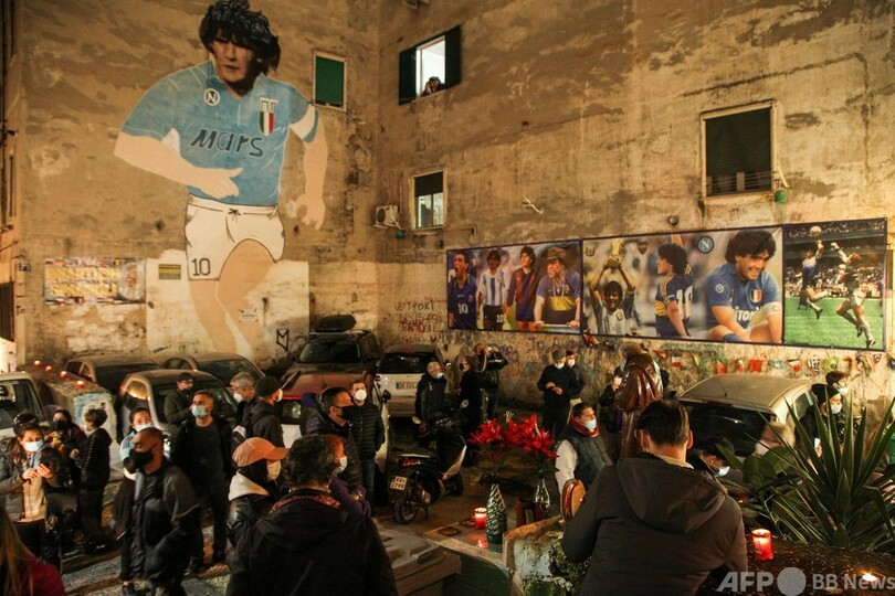 この日、ナポリにあるスペイン地区(Spanish Quarter)の通りには数百人のファンが押し寄せ、クラブの水色のユニホームを着たマラドーナ氏の壁画の下で多くの人がろうそくをともした。壁には「チャオ、サッカーの神よ」と書かれた紙が張られ、ファンは花や手紙を手向けた。