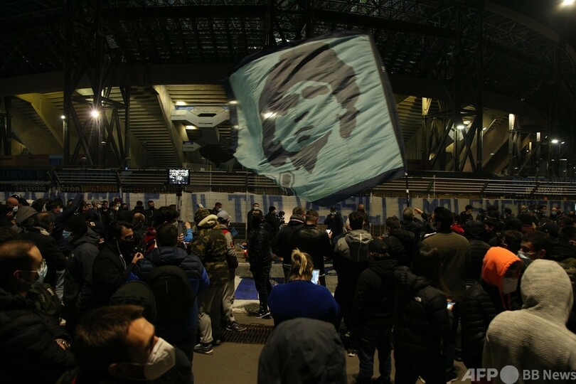 この日、ナポリにあるスペイン地区(Spanish Quarter)の通りには数百人のファンが押し寄せ、クラブの水色のユニホームを着たマラドーナ氏の壁画の下で多くの人がろうそくをともした。壁には「チャオ、サッカーの神よ」と書かれた紙が張られ、ファンは花や手紙を手向けた。