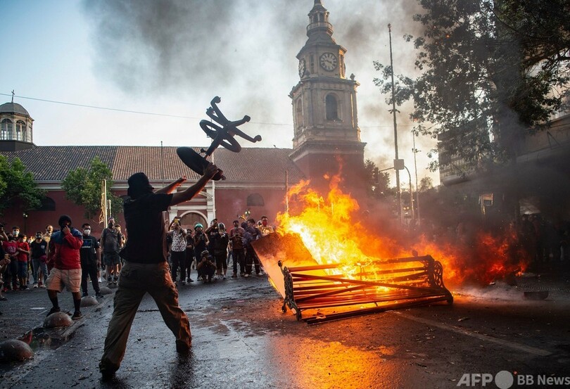 同日には別の女性団体も、男性による暴力撤廃を訴えてサンティアゴでデモを実施。バリケードに火が付けられ、店舗での略奪もあった。(c)AFP