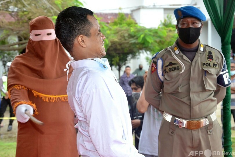インドネシアの中で唯一シャリア(イスラム法)が適用されるアチェ州では、売春や賭博、不倫、飲酒、同性愛者間の性行為などが犯罪とみなされ、刑罰としてむち打ち刑が執行される。通常大勢の見物人が集まるが、新型コロナウイルスの流行に伴い、その数は減っている。(c)AFP