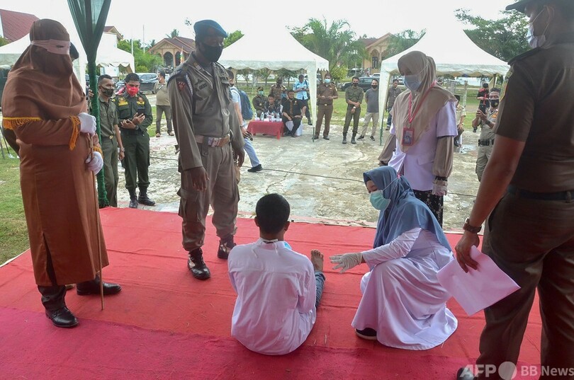 インドネシアの中で唯一シャリア(イスラム法)が適用されるアチェ州では、売春や賭博、不倫、飲酒、同性愛者間の性行為などが犯罪とみなされ、刑罰としてむち打ち刑が執行される。通常大勢の見物人が集まるが、新型コロナウイルスの流行に伴い、その数は減っている。(c)AFP