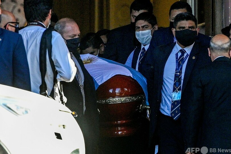アルゼンチン国旗に覆われたマラドーナ氏のひつぎに早朝から大勢のファンが押し寄せた後、鳴り響くサイレンと先導する警察のバイクに囲まれた葬列は、大統領府周辺の通りを急いで走り抜けていった。