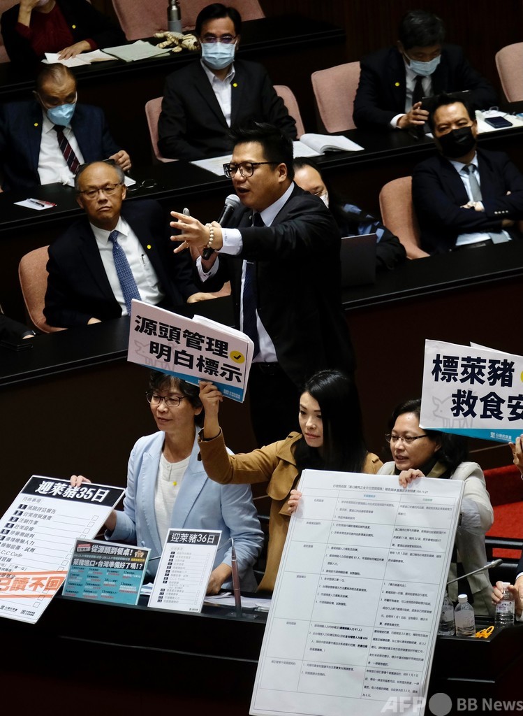 【11月27日 AFP】台湾の立法院(議会)で27日、政府が米国産豚肉の輸入規制緩和を決定したことを受け、野党議員らが議場で豚の内臓などを投げ付けて抗議した。